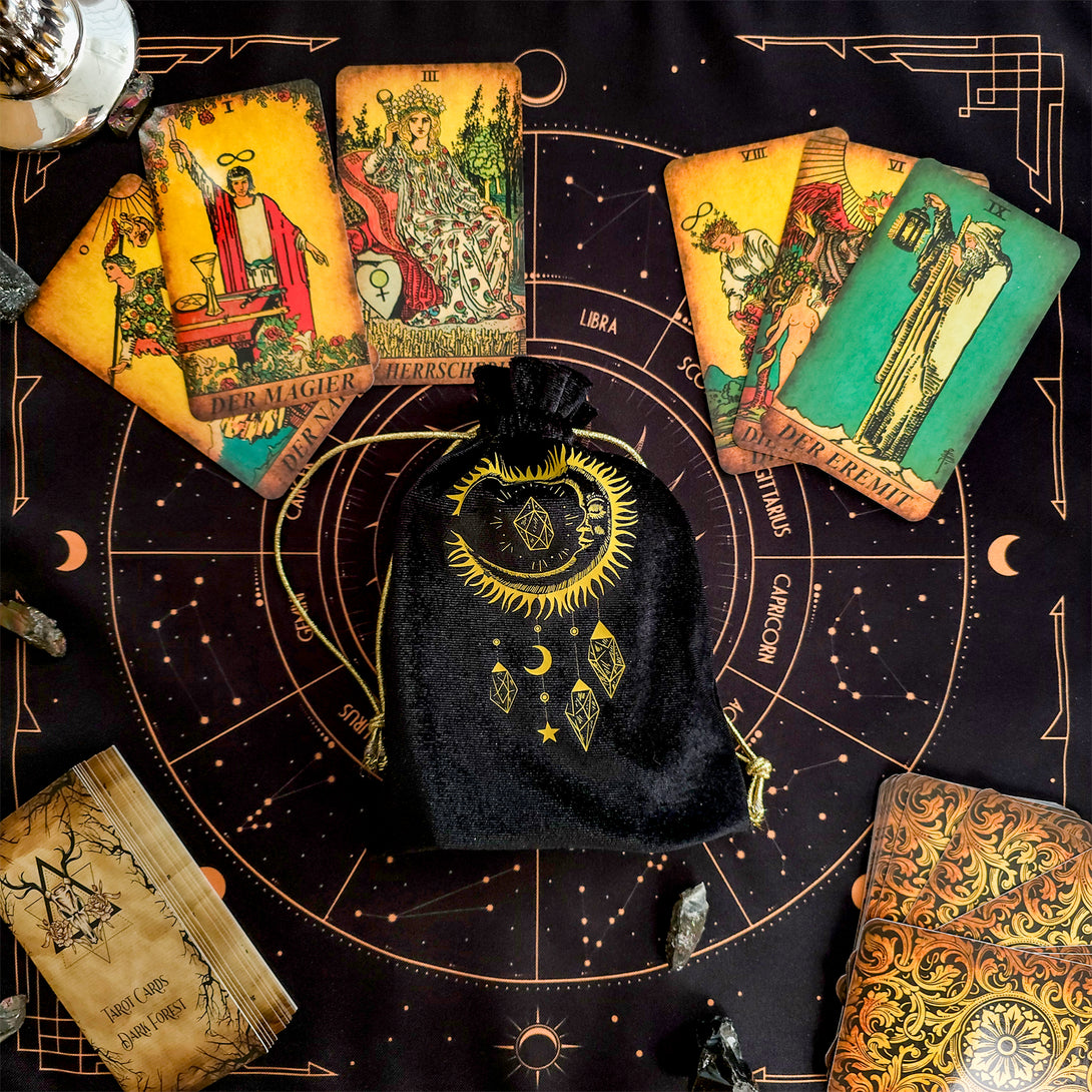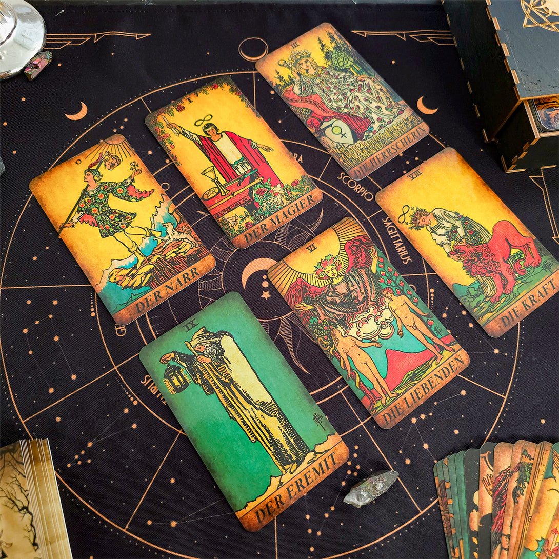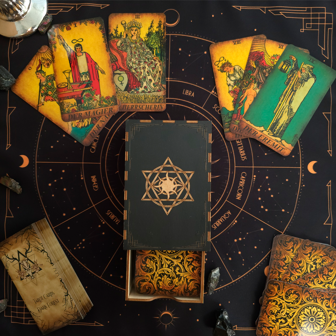 We recommend starting with our classic Rider-Waite-style deck. It’s the go-to choice for beginners and comes with everything you need to get started. View the deck